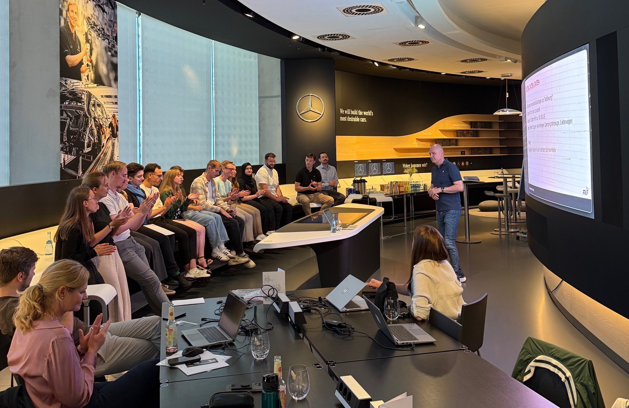 Am dritten und letzten Programmtag starteten wir nach einem gemeinsamen Frühstück mit der Bahn zum Mercedes Benz Museum. Dort arbeiteten wir den Vormittag über in zwei Gruppen an den je drei Aufgaben des Workshops. Dafür unterteilten wir uns je in Kleingruppen und erstellten Modellierungen mit R, hinterfragten die Idee der Wochenendkasko und machten uns Gedanken zur Höhe einer Mallorca-Police. Nach einem leckeren Mittagessen im hauseigenen Restaurant blieb kurz Zeit unsere Präsentationen zu finalisieren, bevor Martin Siefen von der Fahrlehrerversicherung VaG aus dem Nähkästchen plauderte, wie ein Aktuar in einer kleinen VVaG arbeitet. Darauf folgten unsere Präsentationen zu unseren Ideen, Erkenntnissen und Ergebnissen des Studierendenworkshops.